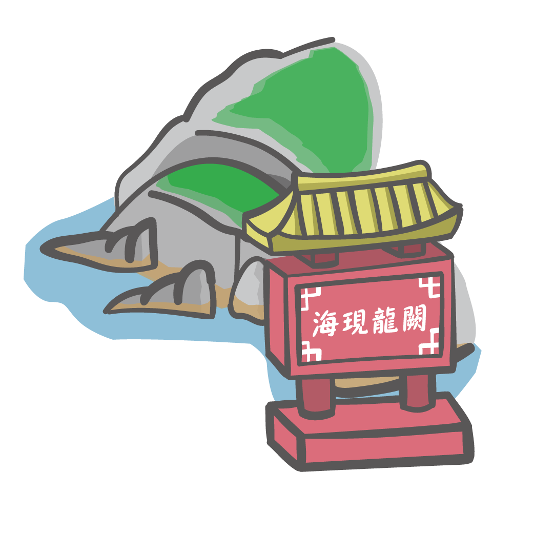 位於加油站旁的小徑下方,風虎角的東側海濱,因迎風面之岩體經年累月被狂風夾帶巨浪沖擊,將海濱之花崗岩地質地盤,沖刷出一條寬度逾丈的缺縫及一道海蝕門。每當風浪稍大,黝黑的岩石在風浪中若隱若現,風平浪靜時則能觀賞到岩層豐富的節理,每當霧季時,浪花滔天,則彷彿可以看到一條海龍翻騰戲水,因此得名「海現龍闕」,又稱「潛龍鬧海」。